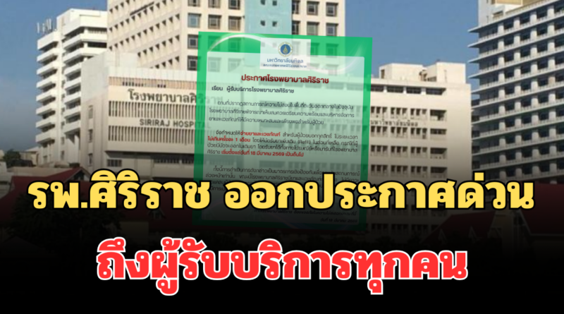 วันที่ 19 มีนาคม 2569 โรงพยาบาลศิริราช ได้ออกประกาศแจ้งผ่านเพจ Siriraj Hospital ถึงผู้รับบริการโรงพยาบาลศิริราชทุกคน โดยระบุว่า