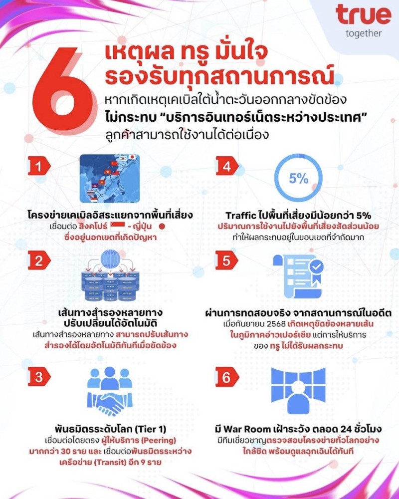 – โครงข่ายการเชื่อมต่อระหว่างประเทศของทรูรองรับด้วยระบบเคเบิลใต้น้ำ SJC2 (Southeast Asia-Japan Cable 2) ซึ่งเชื่อมต่อระหว่างสิงคโปร์และญี่ปุ่น โดยมีเส้นทางแยกออกจากภูมิภาคที่ได้รับผลกระทบอย่างชัดเจน และยังคงให้บริการได้ตามปกติอย่างต่อเนื่องโดยไม่ได้รับผลกระทบ