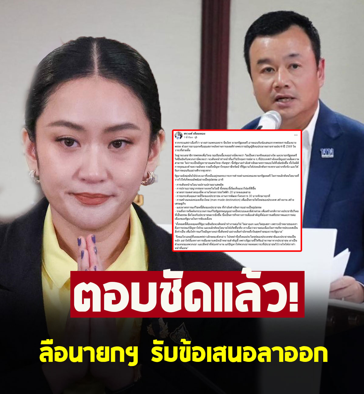 “จากกระแสข่าวลือที่ว่า นางสาวแพทองธาร ชินวัตร นายกรัฐมนตรี อาจตอบรับข้อเสนอจากพรรคการเมืองบางพรรค ด้วยการลาออกหรือยุบสภาหลังผ่านการลงมติร่างพระราชบัญญัติงบประมาณรายจ่ายประจำปี 2569 ในวาระที่สามนั้น