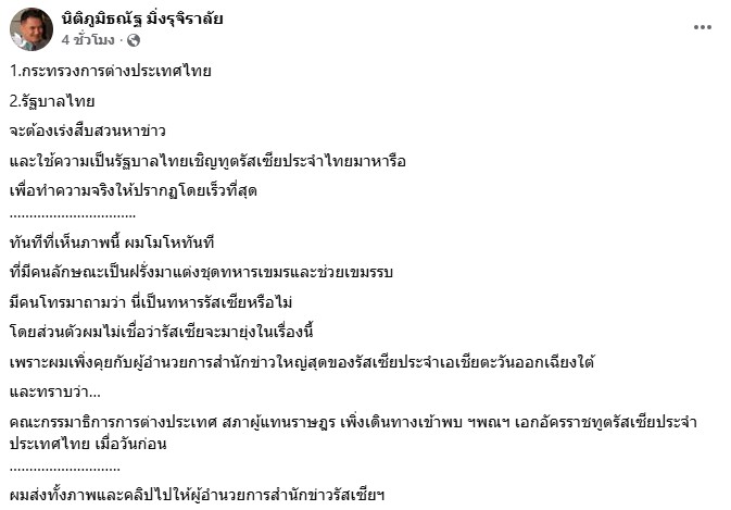 จะต้องเร่งสืบสวนหาข่าว และใช้ความเป็นรัฐบาลไทยเชิญทูตรัสเซียประจำไทยมาหารือ เพื่อทำความจริงให้ปรากฏโดยเร็วที่สุด