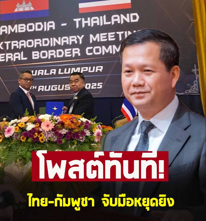 ได้ข้อตกลงร่วมกันแล้ว สำหรับการประชุมวิสามัญของคณะกรรมการชายแดนทั่วไทย กัมพูชา-ไทย โดยมีผู้เข้าร่วมสังเกตุการณ์จากมาเลเซีย สหรัฐอเมริกา และสาธารณรัฐประชาชนจีน โดย นายฮุน มาเนต นายกรัฐมนตรีของกัมพูชาโพสต์เฟซบุ๊กส่วนตัวว่า
