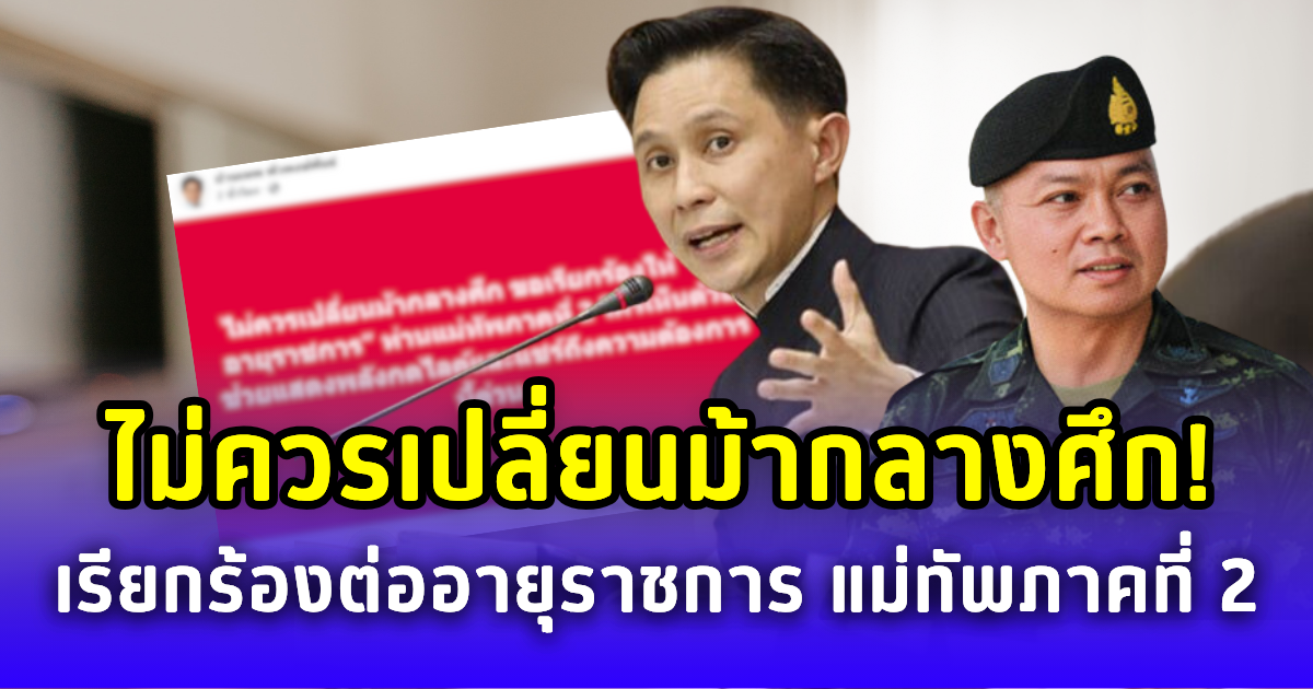 ไม่ควรเปลี่ยนม้ากลางศึก ขอเรียกร้องให้ ต่ออายุราชการ ท่านแม่ทัพภาคที่ 2 ใครเห็นด้วยช่วยแสดงพลังกดไลค์และแชร์ถึงความต้องการนี้ด่วน