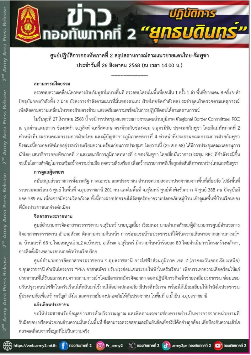 26 สิงหาคม 2568 กองทัพภาค 2 รายงานสถานการณ์ ตรวจพบความเคลื่อนไหวทหารฝ่ายกัมพูชาในบางพื้นที่ พร้อมตรวจพบโดรนในพื้นที่ตอนใน 1 ครั้ง 1 ลำ และพื้นที่ชายแดน 8 ครั้ง 9 ลำ กองกำลังทั้งสองฝ่ายยังวางกำลังตามแนวที่มั่นของตนเอง ฝ่ายไทยจัดกำลังพลประจำจุดเฝ้าตรวจ พร้อมติดตามความเคลื่อนไหวและเตรียมความพร้อมในการตอบโต้