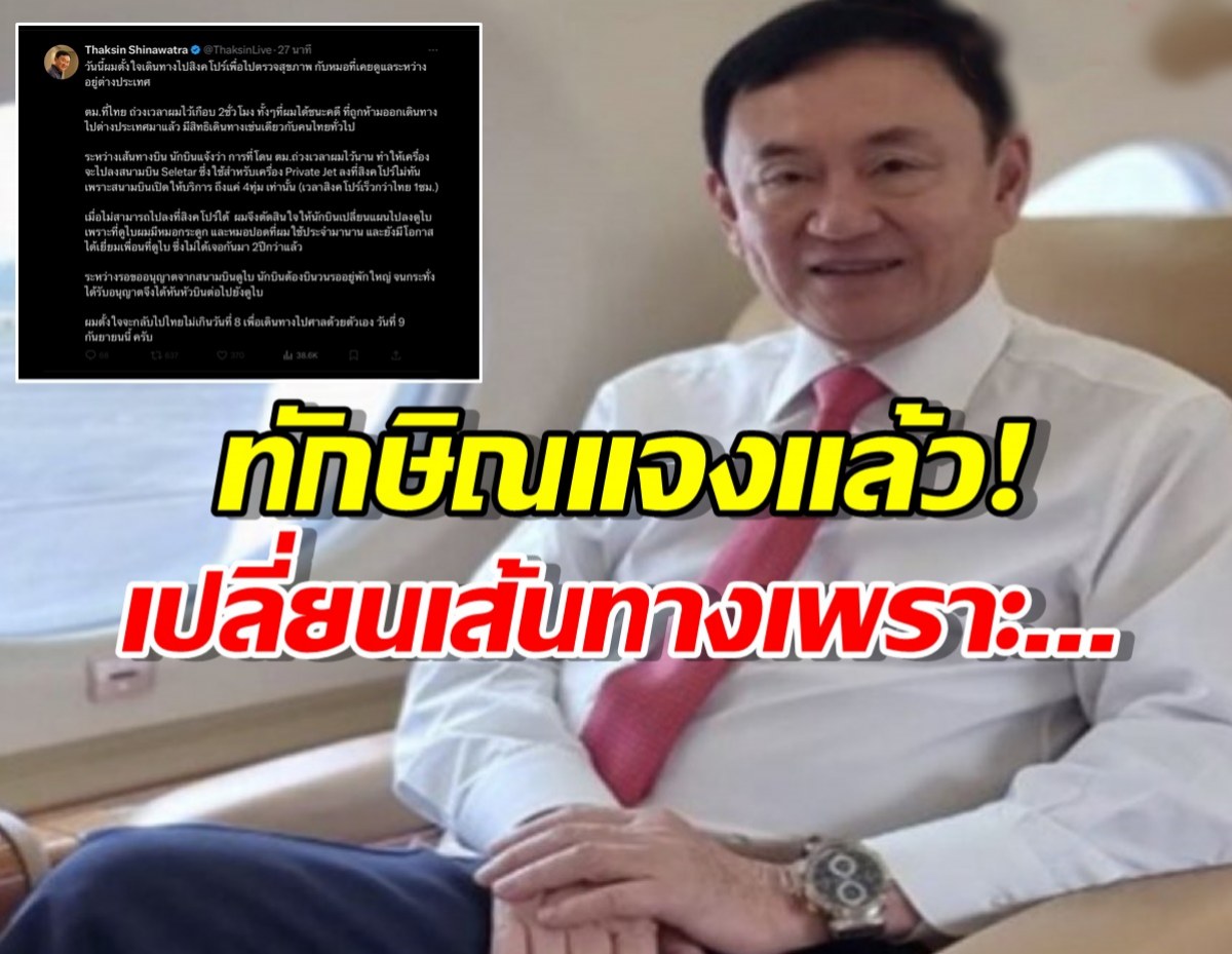 นาย ทักษิณ ชินวัตร อดีต นายกรัฐมนตรี โพสต์ข้อความผ่าน X ชี้แจงสาเหตุ เครื่องบินส่วนตัวเปล่ยนเส้นทางจากสิงคโปร์ ไปดูไบ สหรัฐอาหรับเอมิเรต แทน ว่า