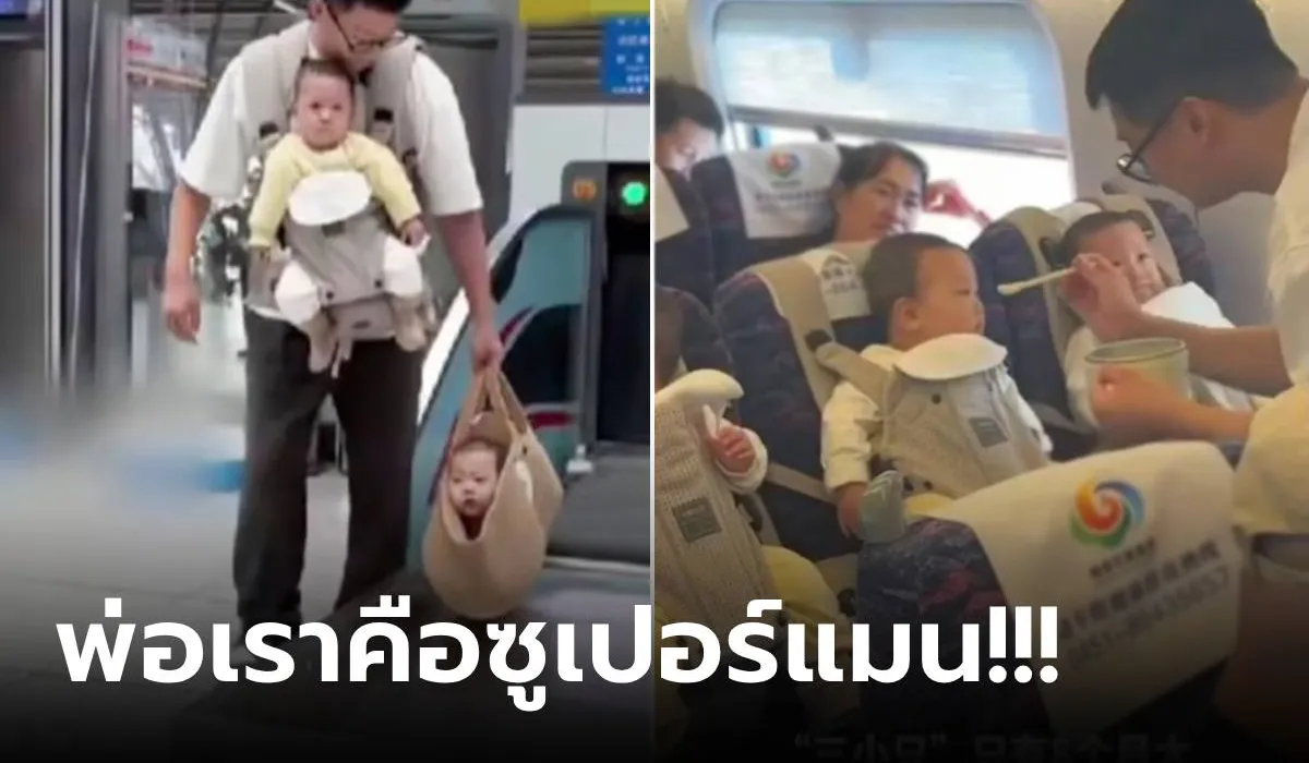 ตามรายงานของหนังสือพิมพ์ People’s Daily ในช่วงวันหยุดวันชาติจีน เมื่อวันที่ 6 ตุลาคม ที่ผ่านมา นักท่องเที่ยวจากฉางชุน มณฑลจี๋หลิน ได้เก็บภาพฉากน่ารักๆ บนรถไฟความเร็วสูง เมื่อคุณพ่อคนหนึ่งใช้เป้อุ้มเด็ก “แขวน” ลูกแฝดสามวัยแปดเดือน เรียงกันไว้บนเก้าอี้นั่งของแต่ละคน โดยผูกอย่างแน่นหนาให้แน่ใจว่าจะไม่เกิดอันตรายระหว่างเดินทาง