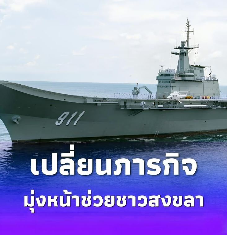 ‘เรือหลวงจักรีนฤเบศร’ เปลี่ยนภารกิจสู่ ‘บก.ลอยน้ำ’ มุ่งหน้าช่วยชาวสงขลา