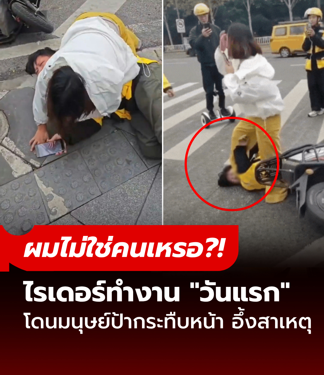 สะเทือนใจ! ไรเดอร์หนุ่มทำงาน “วันแรก” โดนมนุษย์ป้าเมาแอ๋ตบ-กระทืบหน้าระบายอารมณ์ ปล่อยโฮถาม “ผมไม่ใช่คนเหรอ?”