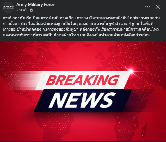 วันที่ 13 ธันวาคม 2568 มีรายงานว่า เพจเฟซบุ๊ก Army Military Force ได้โพสต์รายงานสถานการณ์ล่าสุดชายแดนไทย-กัมพูชา ระบุว่า ด่วน! กองทัพเรือเปิดแนวรบใหม่! หาดเล็ก-เกาะกง เรือรบหลวงระดมยิงปืนใหญ่จากทะเลถล่มชายฝั่งเกาะกง โจมตีต่อตำแหน่งฐานปืนใหญ่ของฝ่ายทหารกัมพูชาจำนวน 4 ฐาน