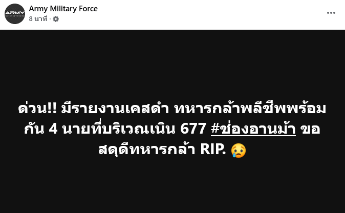 เมื่อเวลา 14.08 น. วันที่ 13 ธันวาคม 2568 เพจเฟซบุ๊ก Army Military Force ซึ่งเป็นเพจที่ได้เกาะติดสถานการณ์ชายเเดนไทย – กัมพูชา อย่างใกล้ชิด ได้รายงานโดยโพสต์ข้อความระบุว่า ด่วน มีรายงานเคสดำ ทหารกล้าพลีชีพพร้อมกัน 4 นายที่บริเวณเนิน 677 ช่องอานม้า ขอสดุดีทหารกล้า RIP