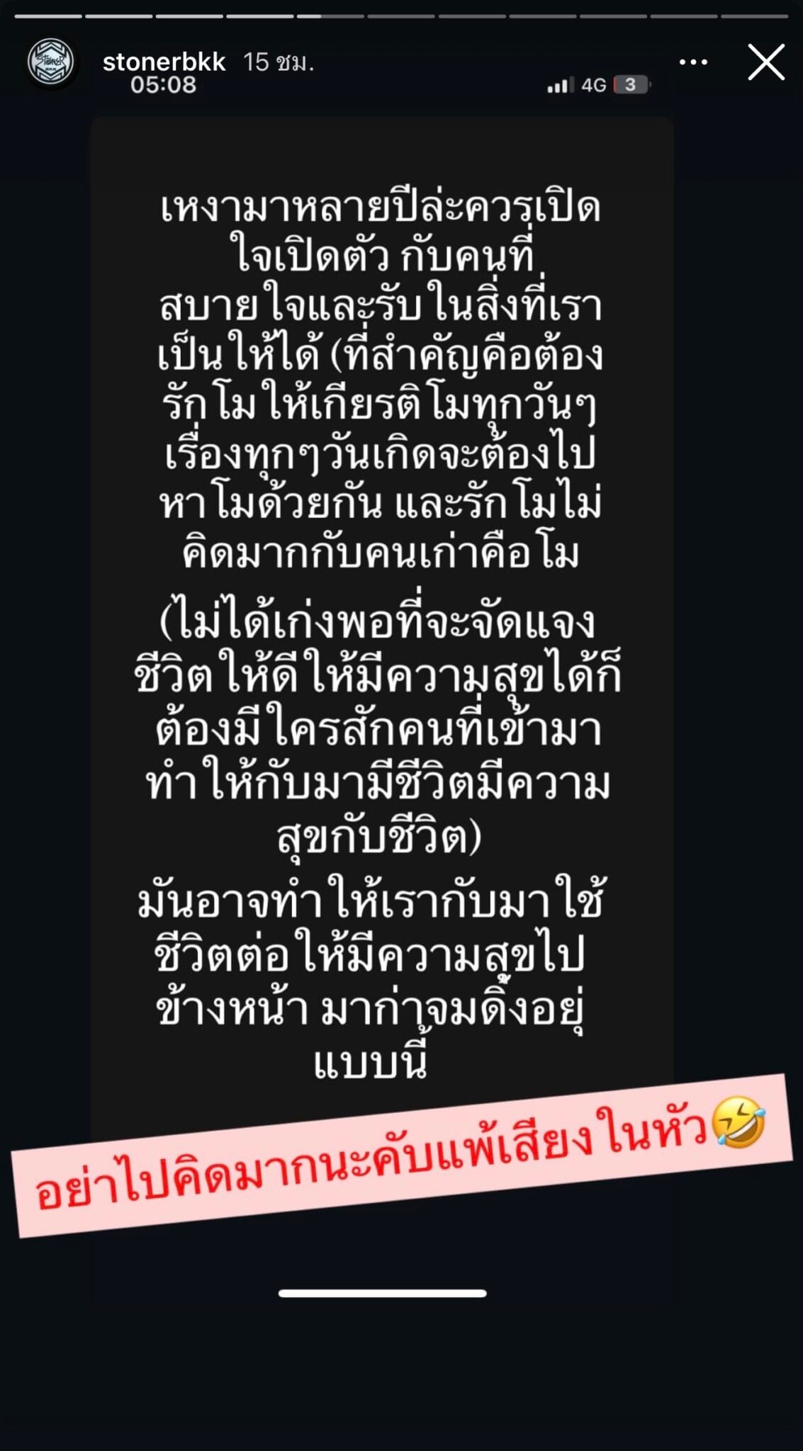 โดย เบิร์ด เทคนิค ได้โพสต์ข้อความระบุว่า “เหงามาหลายปีละ ควรเปิดใจ เปิดตัวกับคนที่สบายใจและรับในสิ่งที่เราเป็นให้ได้ (ที่สำคัญคือต้องรักโม ให้เกียรติโมทุกๆ วัน ทุกๆ เรื่อง ทุกๆ วันเกิดจะต้องไปหาโมด้วยกัน และรักโม ไม่คิดมากกับคนเก่าคือโม (ไม่ได้เก่งพอที่จะจัดแจงชีวิตให้ดีให้มีความสุขได้ ก็ต้องมีใครสักคนที่เข้ามาทําให้กลับมามีชีวิต มีความสุขกับชีวิต) มันอาจทำให้เรากลับมาใช้ชีวิตต่อให้มีความสุข ไปข้างหน้า มากกว่าจมดิ่งอยู่แบบนี้”