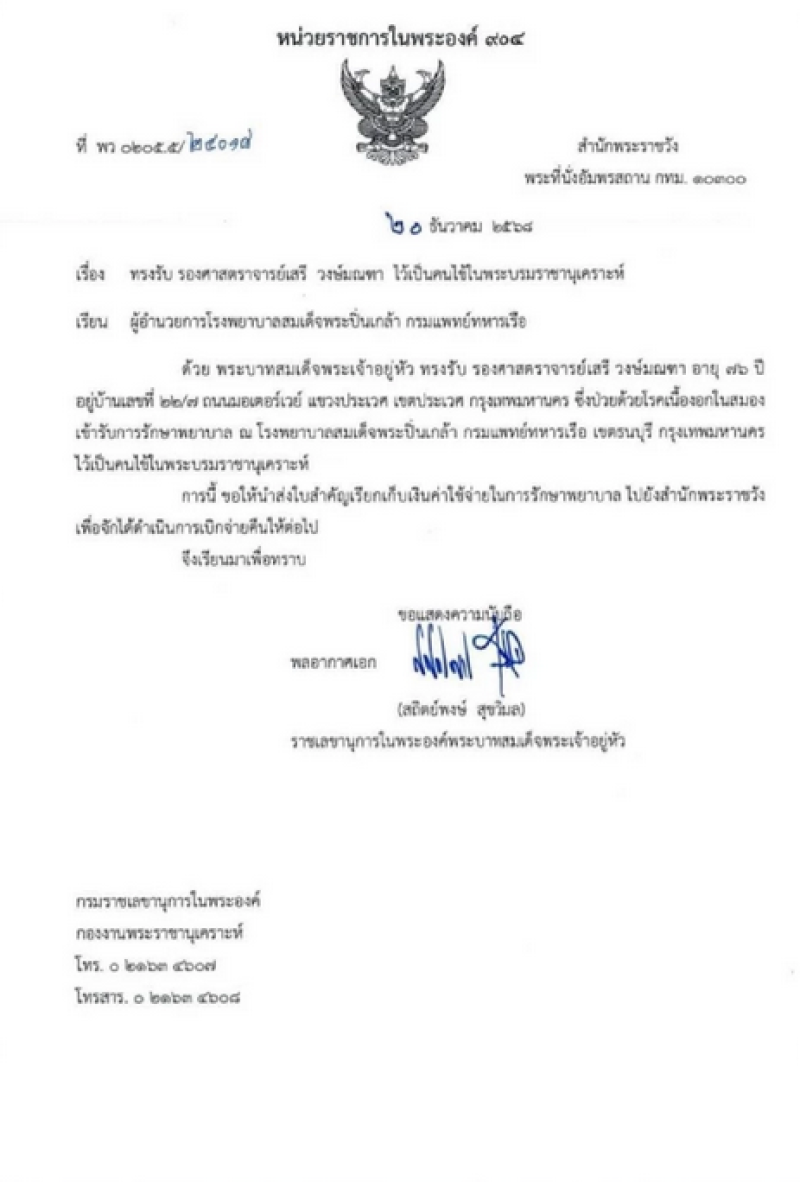 วันที่ 20 ธันวาคม 2568 มีรายงานว่า พล.อ.อ.สถิตย์พงษ์ สุขวิมล ราชเลขานุการในพระองค์พระบาทสมเด็จพระเจ้าอยู่หัว มีหนังสือถึงผู้อำนวยการโรงพยาบาลสมเด็จพระปิ่นเกล้า กรมแพทย์ทหารเรือ แจ้งว่า พระบาทสมเด็จพระเจ้าอยู่หัว ทรงพระกรุณาโปรดเกล้าโปรดกระหม่อมรับ รศ.ดร.เสรี วงษ์มณฑา อายุ 76 ปี ซึ่งป่วยด้วยโรคเนื้องอกในสมอง เข้ารับการรักษาพยาบาล ณ โรงพยาบาลสมเด็จพระปิ่นเกล้า กรมแพทย์ทหารเรือ เขตธนบุรี กรุงเทพมหานคร ไว้เป็นคนไข้ในพระบรมราชานุเคราะห์