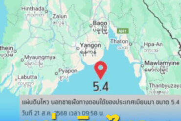 วันที่ 21 ส.ค. สำนักเฝ้าระวังแผ่นดินไหว กรมอุตุนิยมวิทยา รายงานว่า เกิดเหตุแผ่นดินไหวขนาด 5.4 แมกนิจูด มีจุดศูนย์กลางอยู่ในประเทศเมียนมา ที่ระดับความลึก 10 กิโลเมตร จุดศูนย์กลางของแผ่นดินไหวครั้งนี้อยู่ห่างจาก อ.แม่สอด จ.ตาก ไปทางทิศตะวันตกเฉียงเหนือประมาณ 211 กิโลเมตร รายงานจากประชาชนในหลายพื้นที่ของกรุงเทพมหานคร อาทิ อโศก พร้อมพงษ์ ระบุว่า สามารถรับรู้ได้ถึงแรงสั่นสะเทือน โดยเฉพาะผู้ที่พักอาศัยหรือทำงานในอาคารสูง ซึ่งเป็นผลมาจากคลื่นแผ่นดินไหวที่เดินทางมาถึงในระยะทางไกล ทั้งนี้ ยังไม่มีรายงานความเสียหายในพื้นที่ประเทศไทย…
