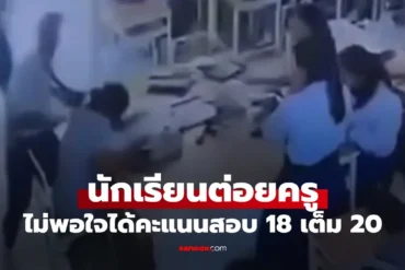 นักเรียนชาย ม.5 เตะต่อยครูสาวกลางห้องเรียน ได้รับบาดเจ็บหนัก เหตุไม่พอใจได้คะแนนสอบ 18 เต็ม 20 วันที่ 10 สิงหาคม 2568 ผู้สื่อข่าวรายงานว่า เกิดเหตุการณ์นักเรียนชายชั้น ม.5 ทำร้ายร่างกายครูสาวจนได้รับบาดเจ็บสาหัส เนื่องจากไม่พอใจผลคะแนนสอบ เหตุเกิดที่จังหวัดอุทัยธานี เมื่อวันที่ 5 สิงหาคมที่ผ่านมา ครูผู้เสียหายเล่าว่า ในวันเกิดเหตุ ขณะเตรียมเข้าไปประกาศผลสอบกลางภาคในห้องเรียน นักเรียนชาย…