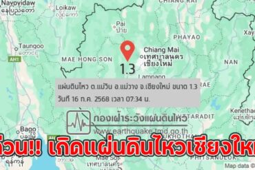 กองเฝ้าระวังแผ่นดินไหว กรมอุตุนิยมวิทยา รายงานด่วน เกิดเหตุ”แผ่นดินไหวเชียงใหม่” ขนาด 1.3 แรงสะเทือนอีกครั้ง ต.แม่วิน อ.แม่วาง ที่ความลึก 1 กิโลเมตร แม้ขนาดไม่รุนแรง แต่สร้างความกังวลให้ชาวบ้านในพื้นที่ ติดตามสถานการณ์ใกล้ชิด วันนี้ 16 กรกฎาคม 2568 เวลา 07.34 น. กองเฝ้าระวังแผ่นดินไหว กรมอุตุนิยมวิทยา ได้ออกมารายงานสถานการณ์แผ่นดินไหวที่เกิดขึ้นในประเทศไทย…