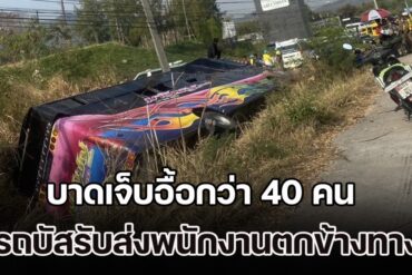 สุดระทึก! รถบัสรับส่งพนักงาน เสียหลักพลิกคว่ำตกข้างทาง บาดเจ็บอื้อกว่า 40 คน